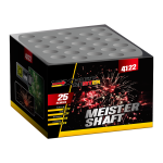 Effectomschrijving: Meistershaft, 25 schuss 26mm Pyromould Batterie. Het meesterschap van siervuurwerk is vaak diversiteit, en dat heeft deze cake, goud, rood, fluit, groen, crackling, spider, Meistershaft heeft het.