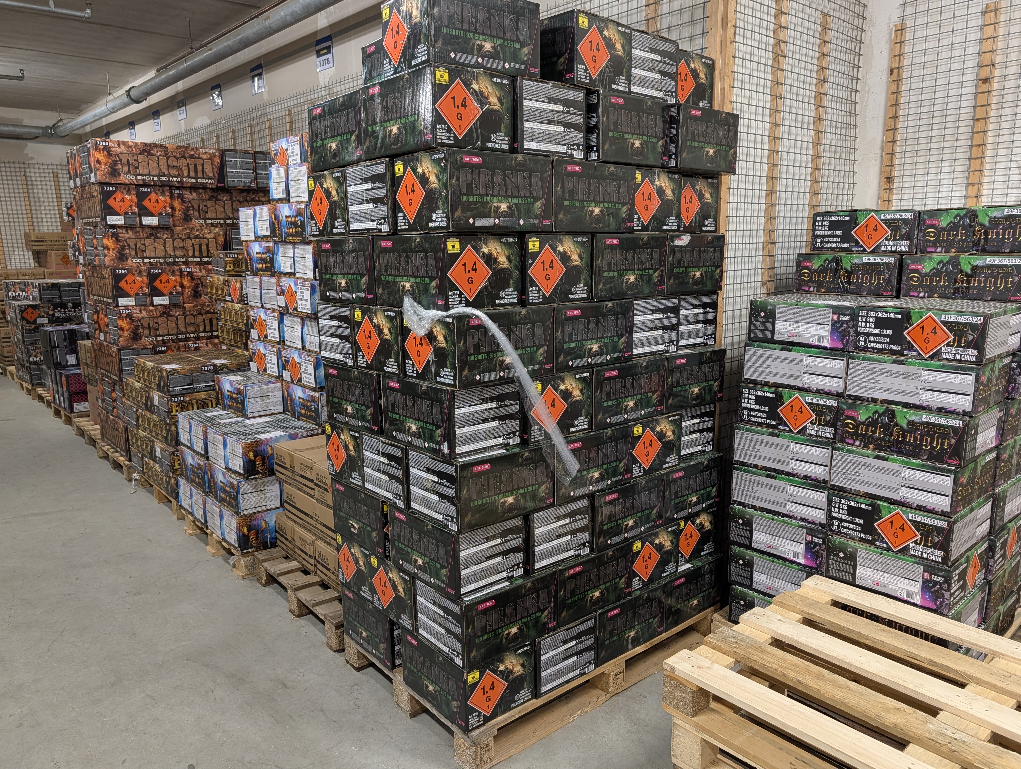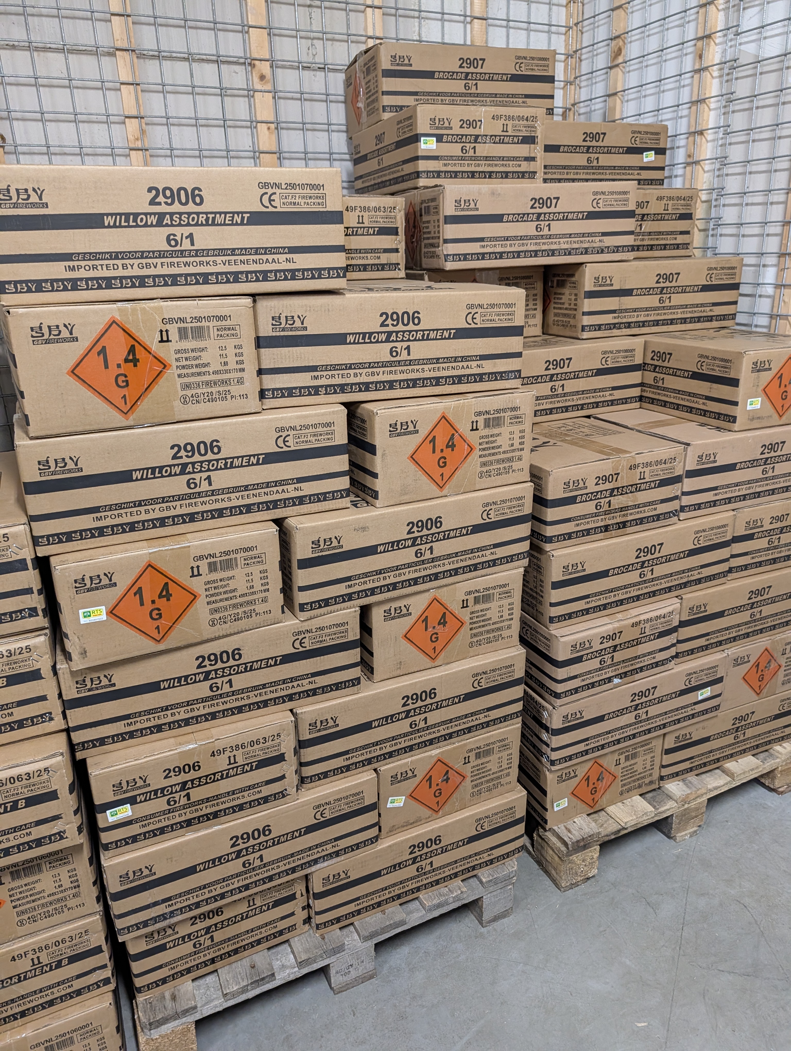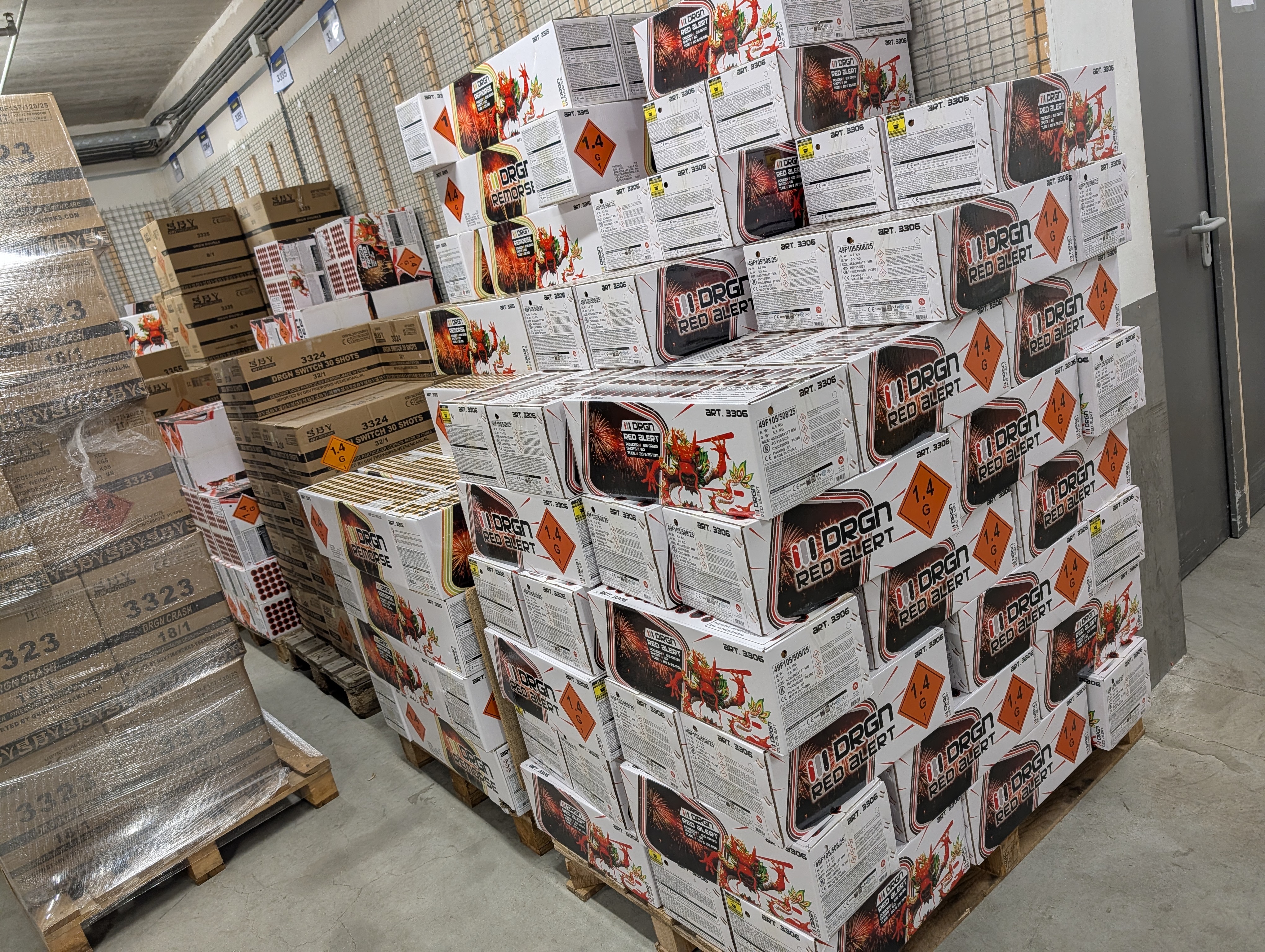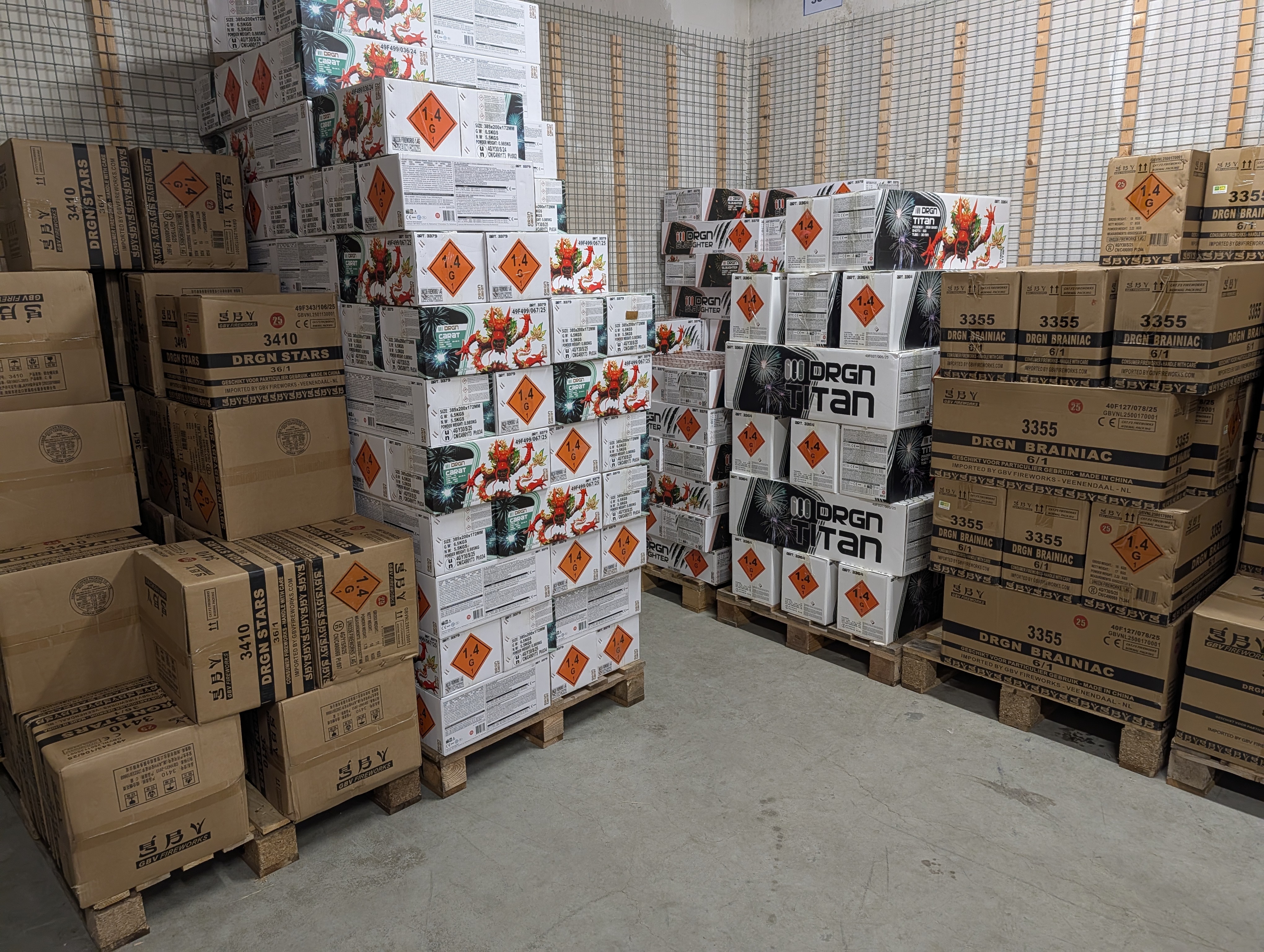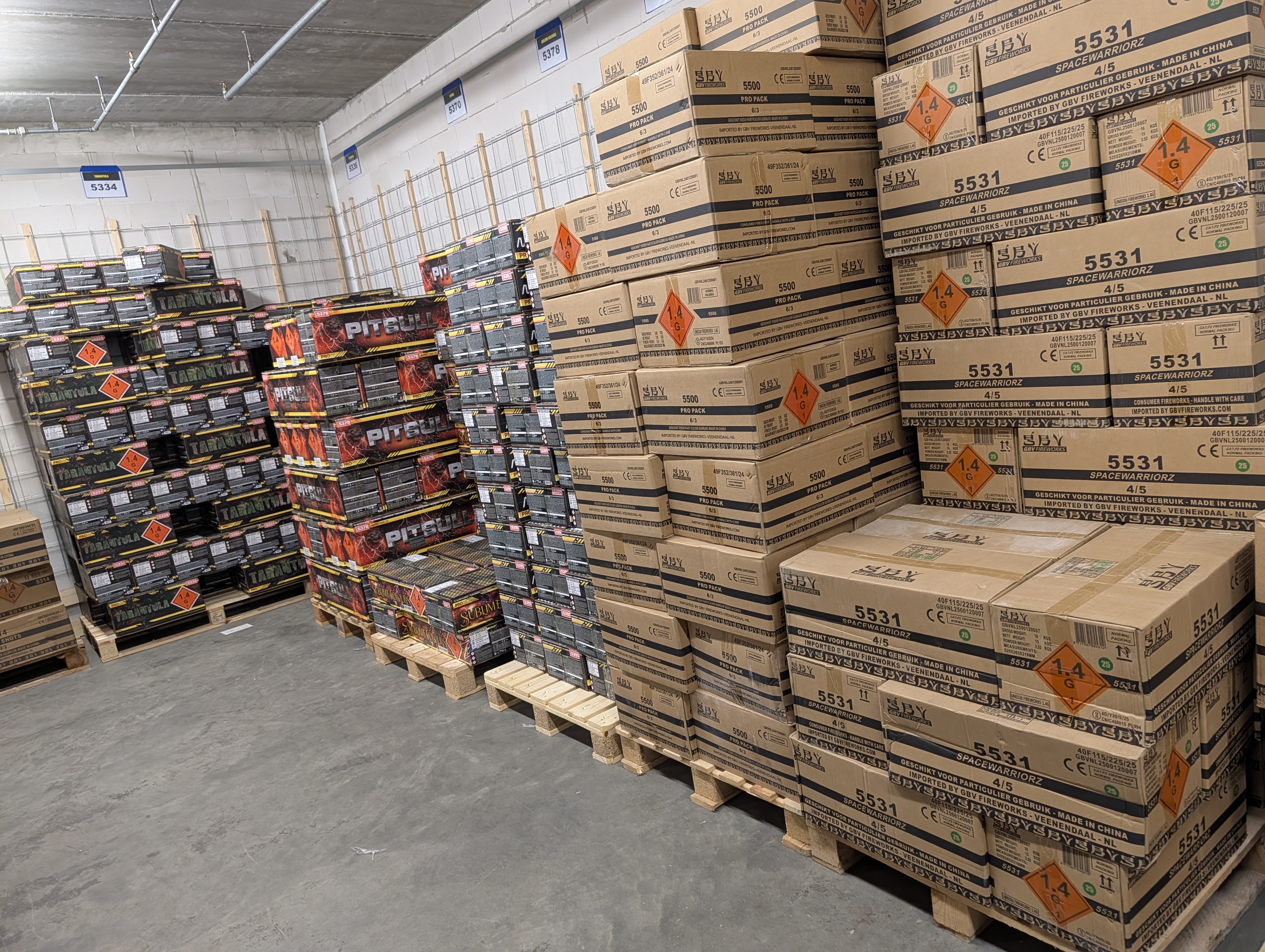 Jasper nam ons mee door de verschillende bunkers om de voorraden te zien, altijd een tof beeld om zoveel vuurwerk bij elkaar te zien.