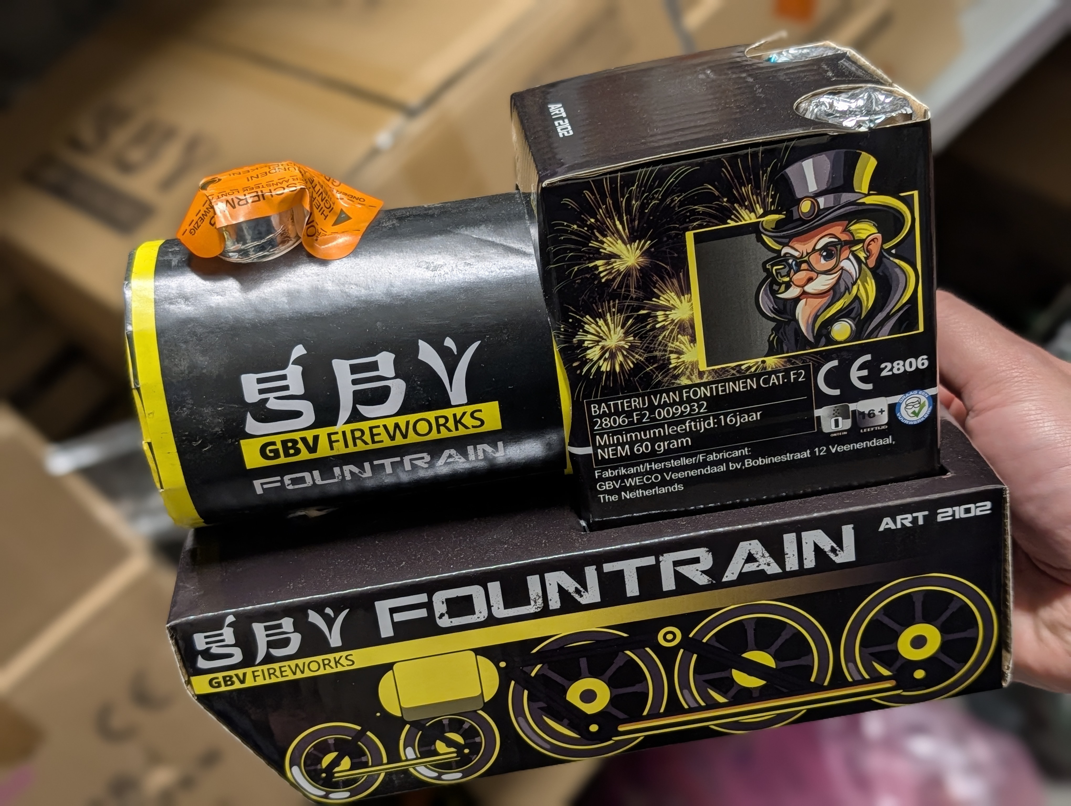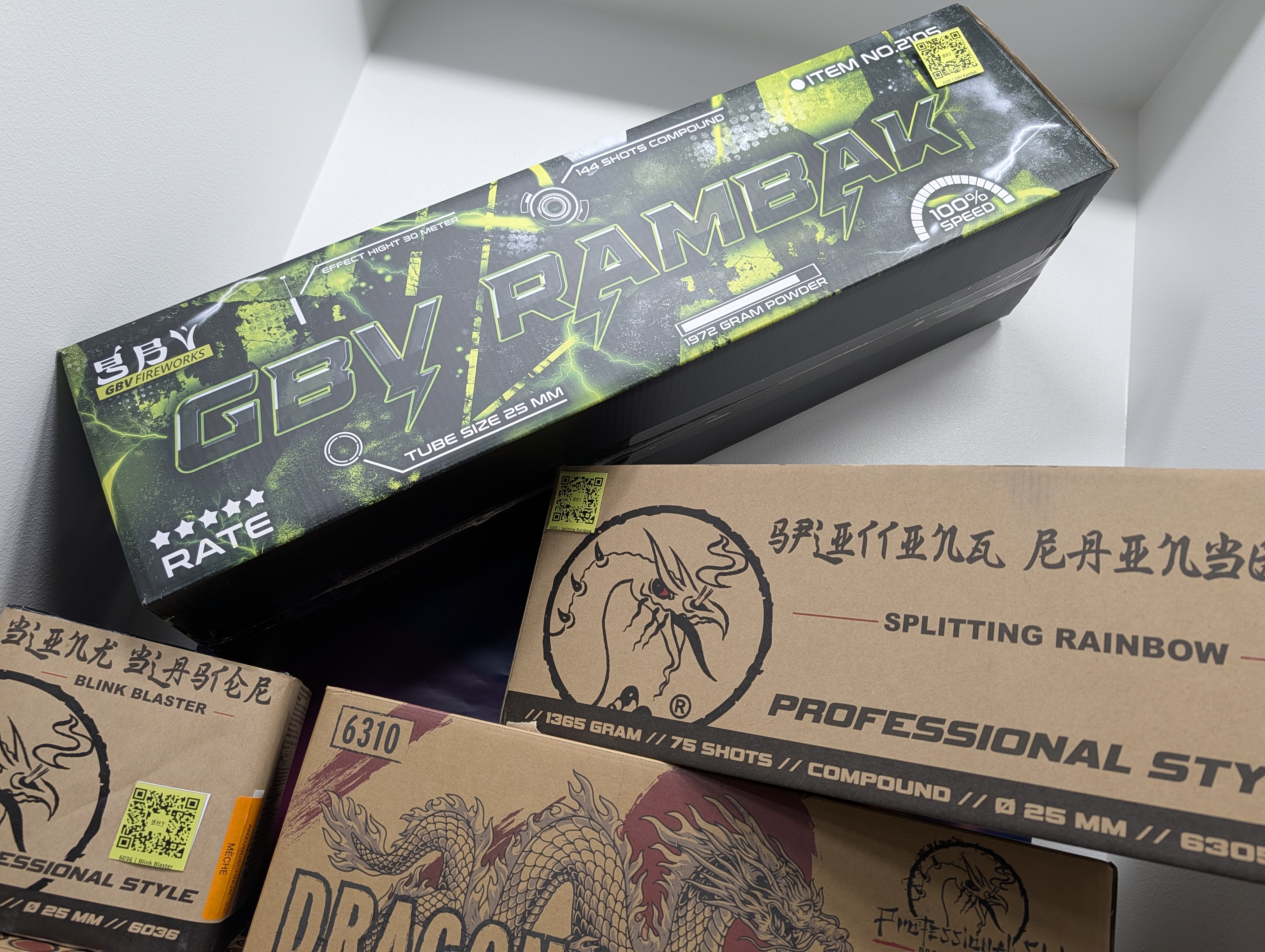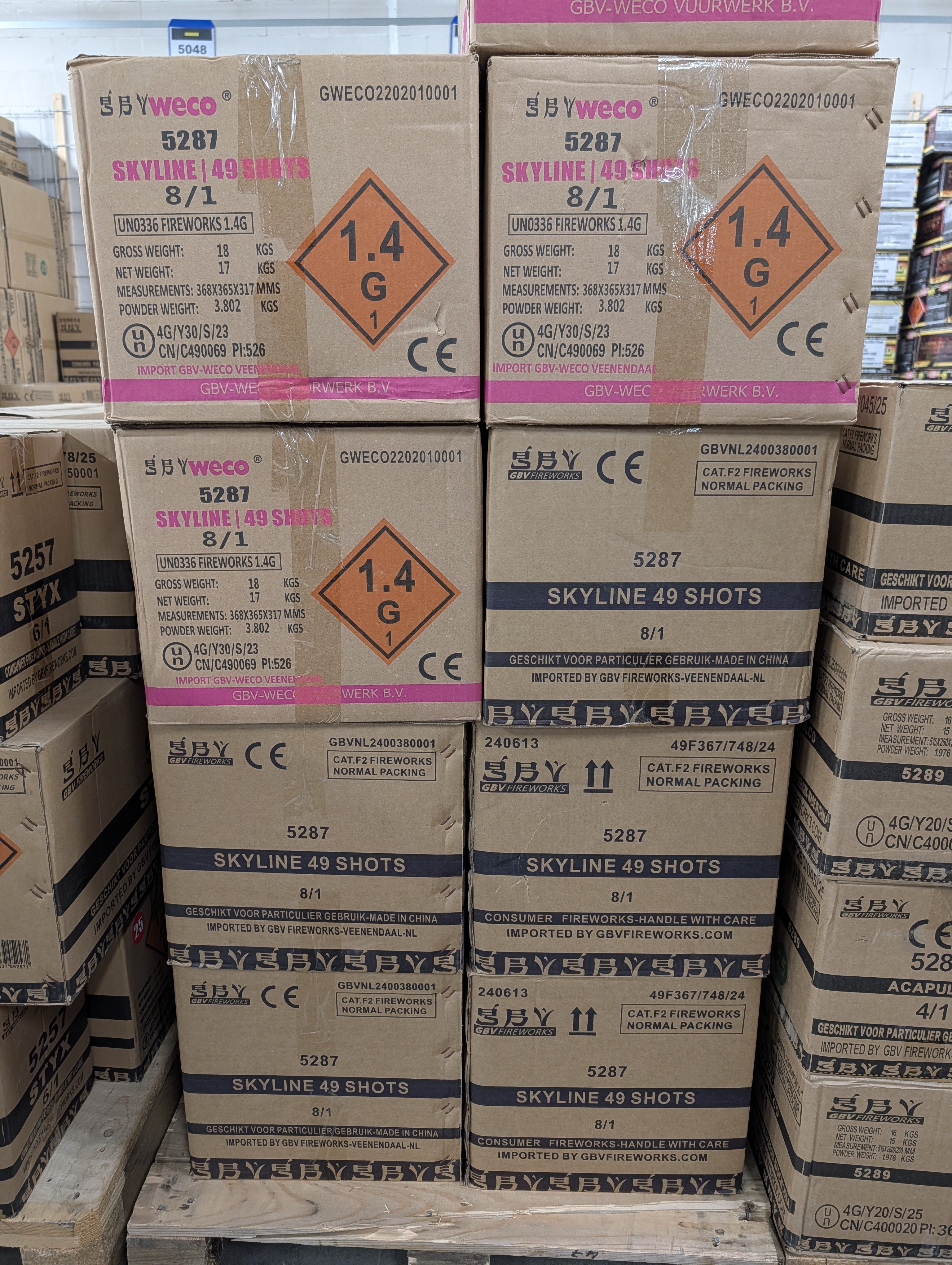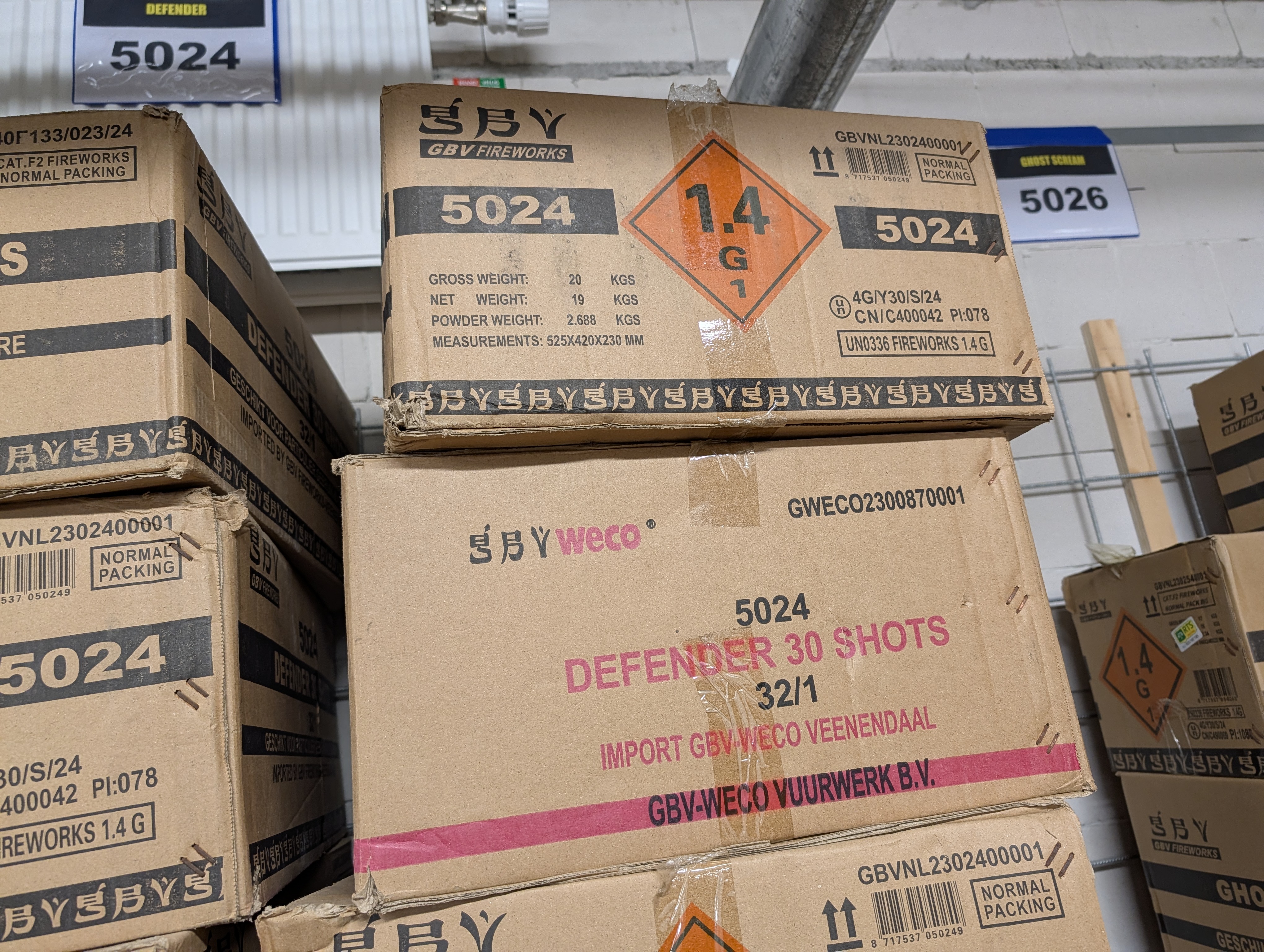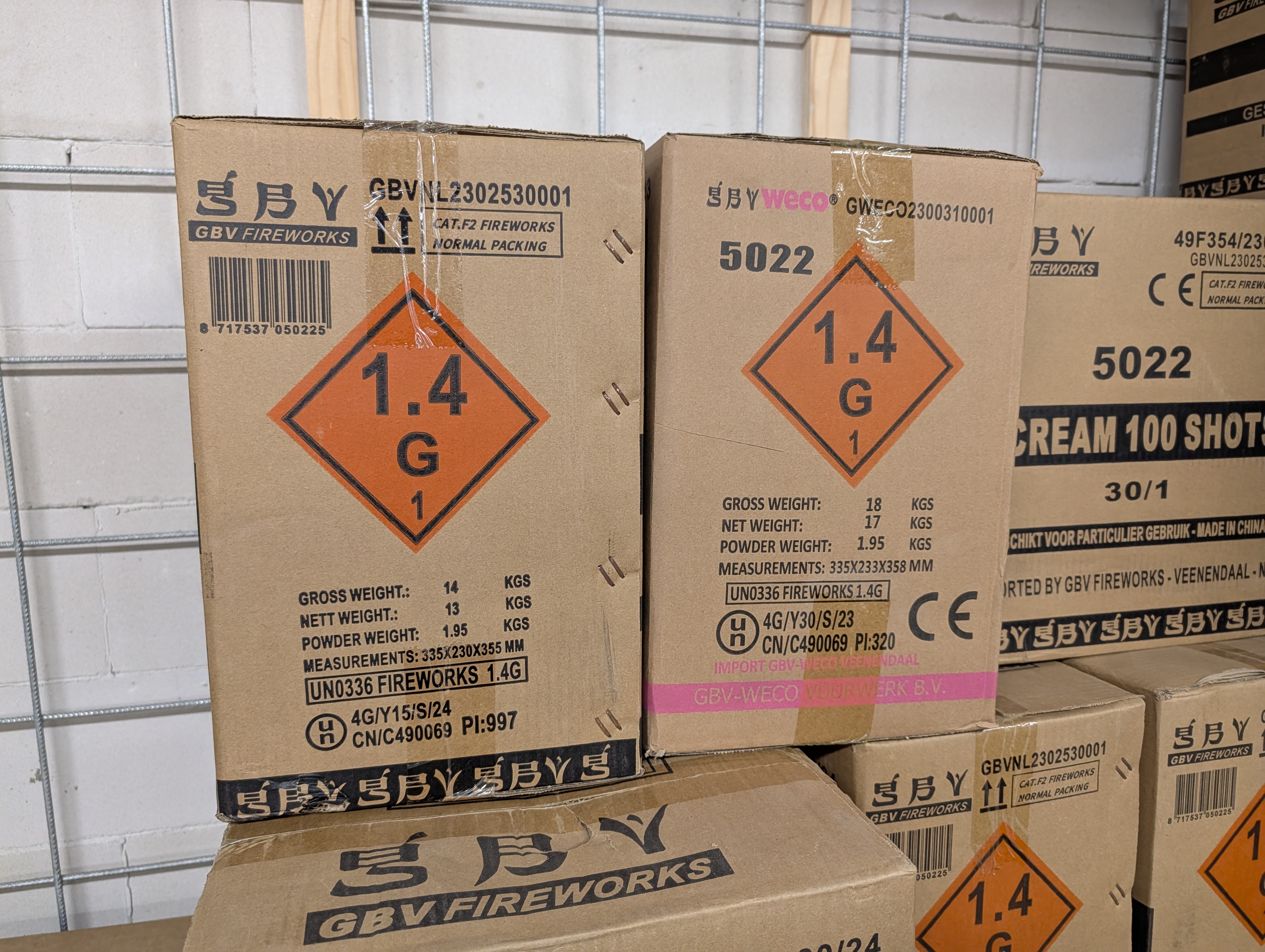We zagen ook her en der nog wat verschillende dozen, namelijk de roze GBV-WECO dozen welke nu allemaal zwart bedrukt zijn met GBV Fireworks. Dit heeft te maken met de Duitse markt waar WECO natuurlijk een groot aandeel heeft, daar kunnen ze niet zomaar met die naam de Nederlandse producten op de markt brengen. Daarom is recenter alles al aangepast om internationaal geen belemmeringen te hebben, hier wat voorbeelden;